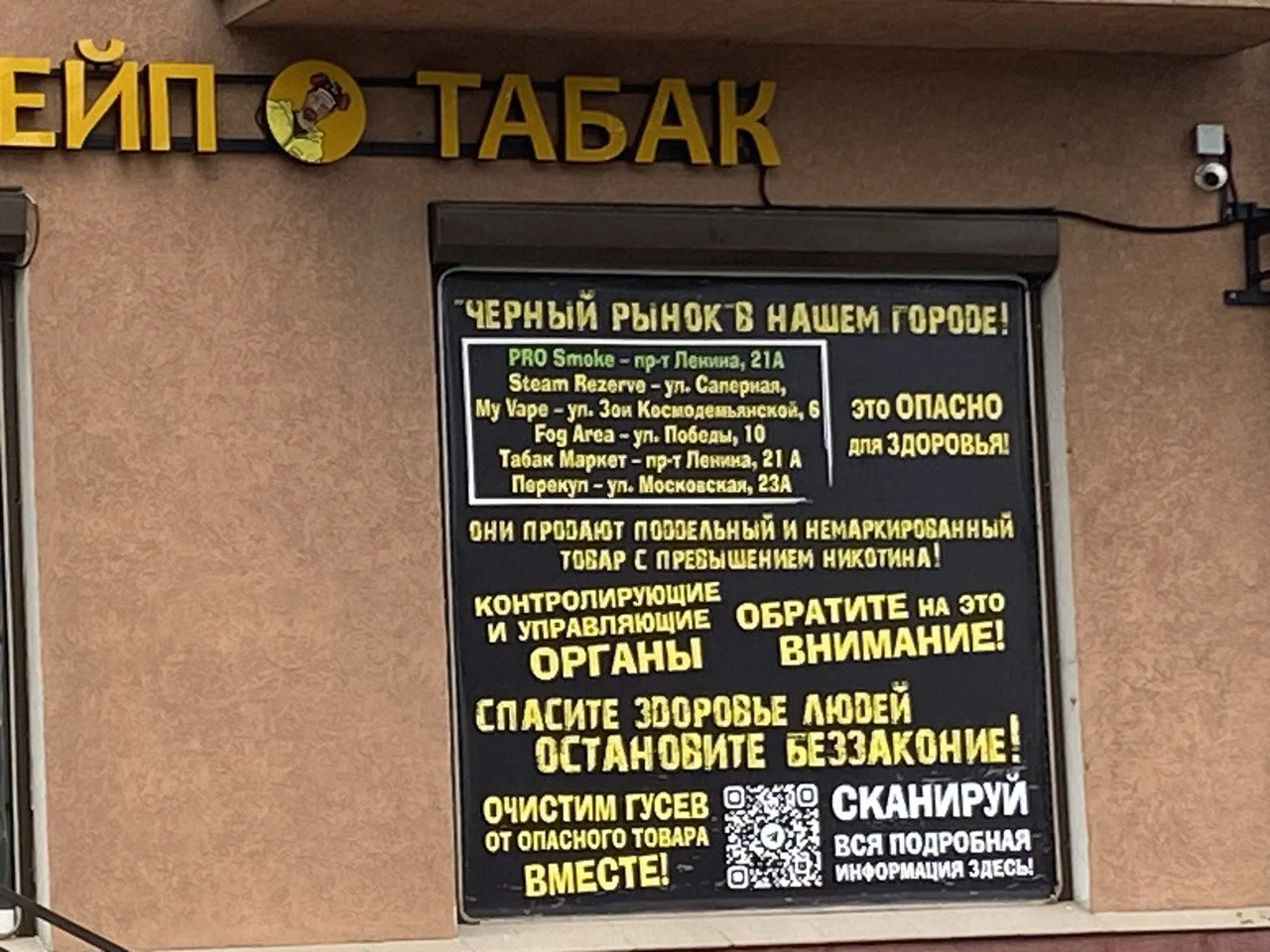 У входа в магазин «Вейп-табак» на улице Менделеева на окне появился текст, который начинается со слов «Чёрный рынок в нашем городе!». Там также указаны адреса магазинов, где якобы продают опасную для здоровья табачную продукцию.